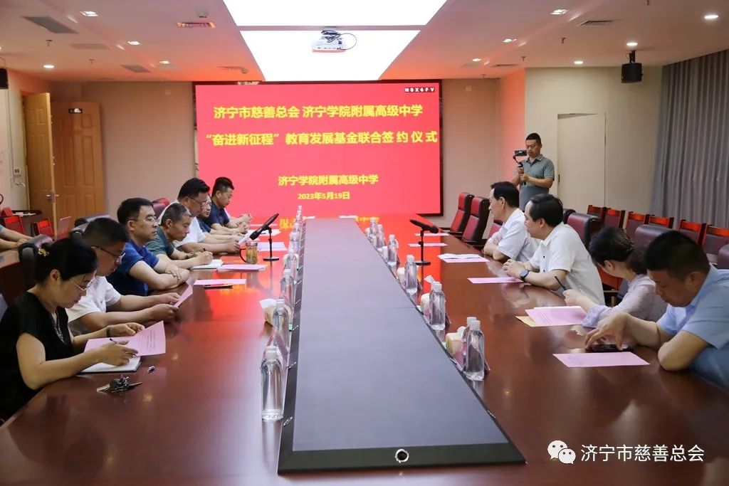 5月19日,济宁学院附属高级中学“奋进新征程”教育发展基金联合募捐签约仪式举行。市慈善总会会长贾丽建出席并讲话,市慈善总会办公室主任曹鲁平与济宁学院附属高级中学党委委员、副校长张留营签订《联合募捐协议》,济宁学院附属高级中学党委副书记靳继东致辞,济宁学院附属高级中学党委委员、副校长马一鸣、王永强,济宁学院附属高级中学党委委员、纪检书记胡波等参加,济宁学院附属高级中学工会主席李广生主持活动仪式。
