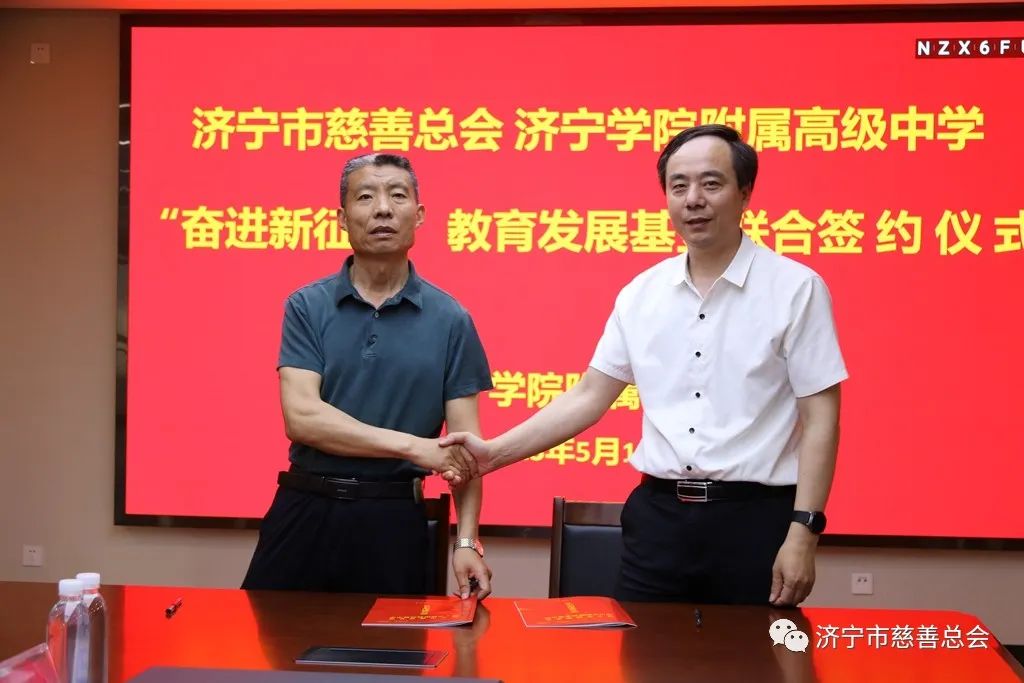 市慈善总会办公室主任曹鲁平(右)与济宁学院附属高级中学党委委员、副校长张留营(左)签订《联合募捐协议》